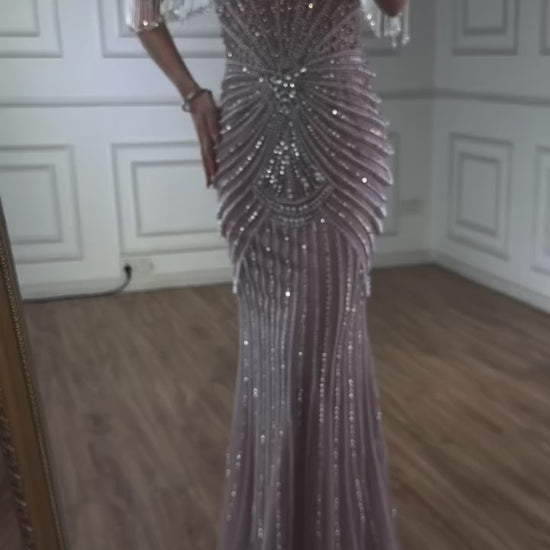 An elegant party dress with dazzling, stone-embellished off-shoulder sleeves.