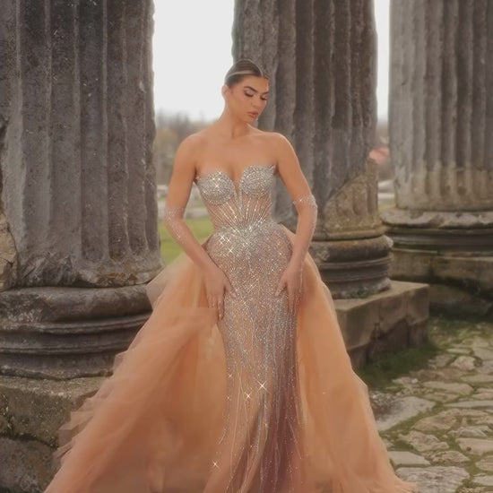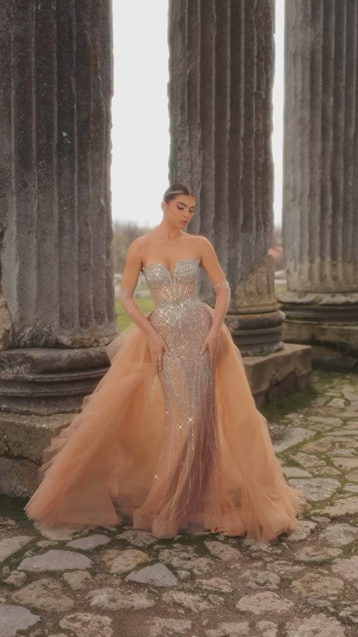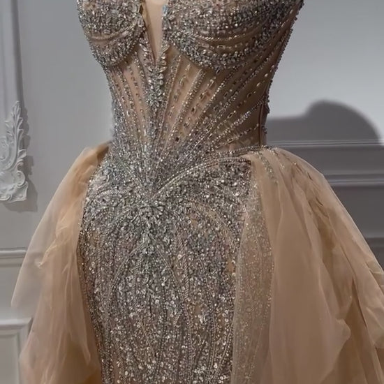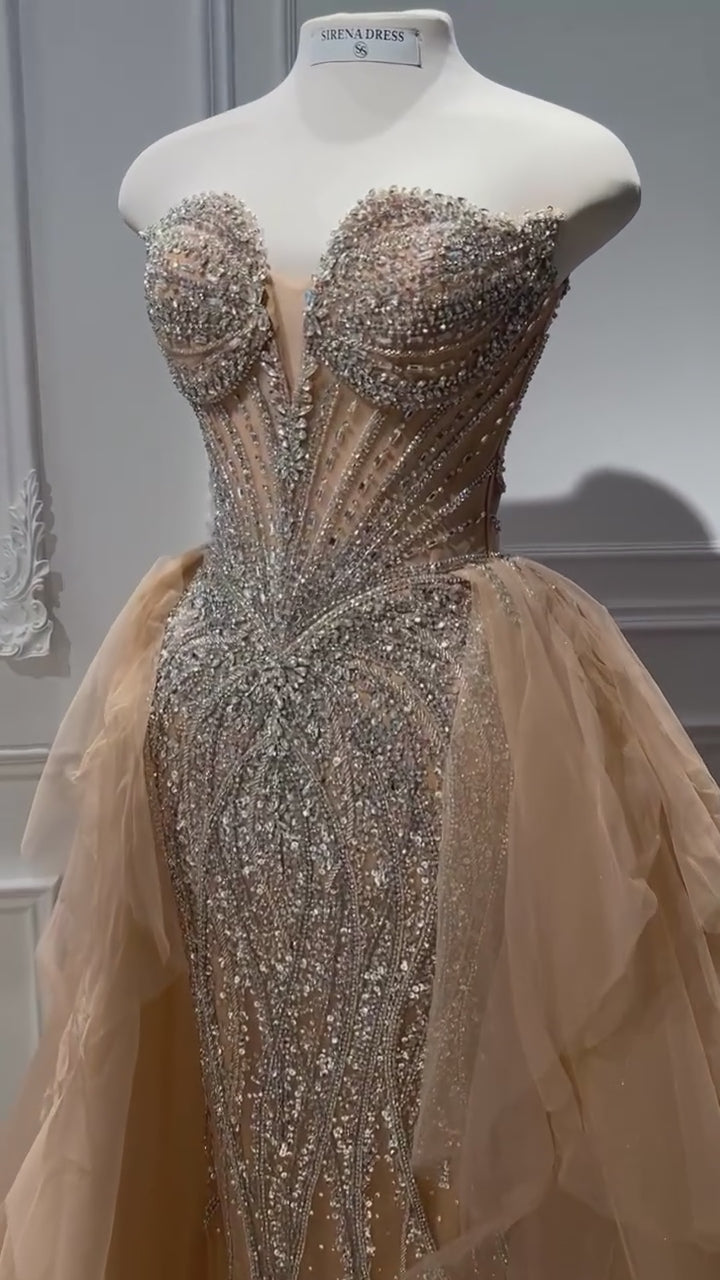 Elegant and luxurious dress adorned with sparkling crystals and gemstones, featuring a long back piece and long sleeves with cuffs.