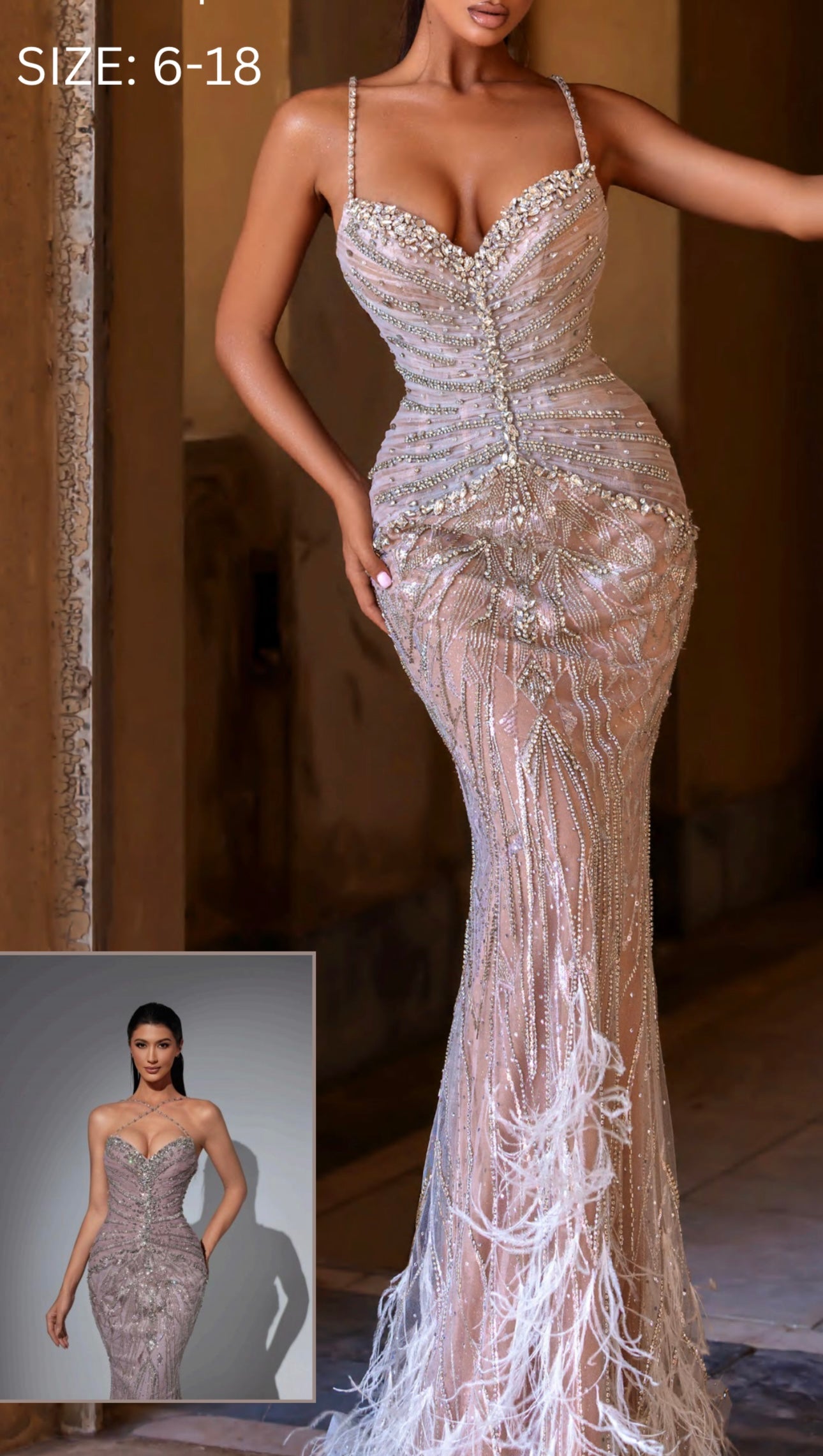 Elegant dress embellished with crystals, a blend of two colors, featuring feathers at the bottom.
