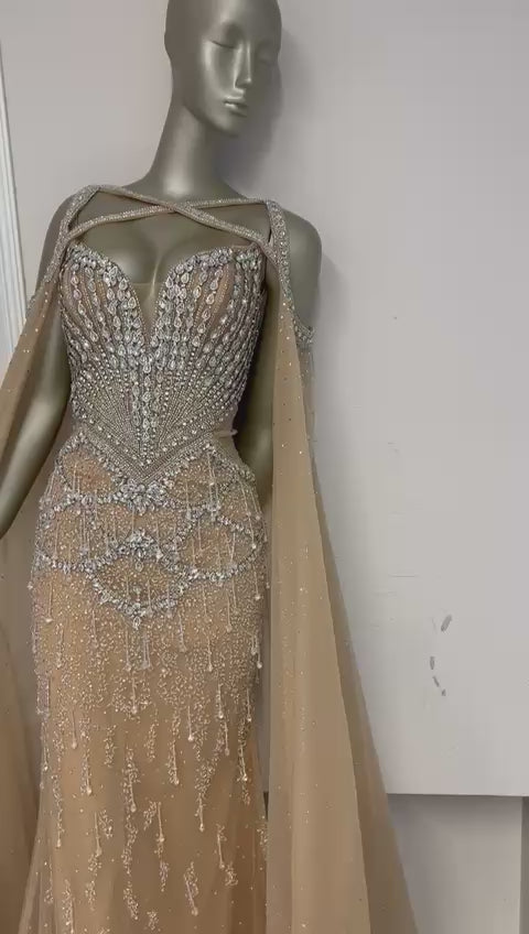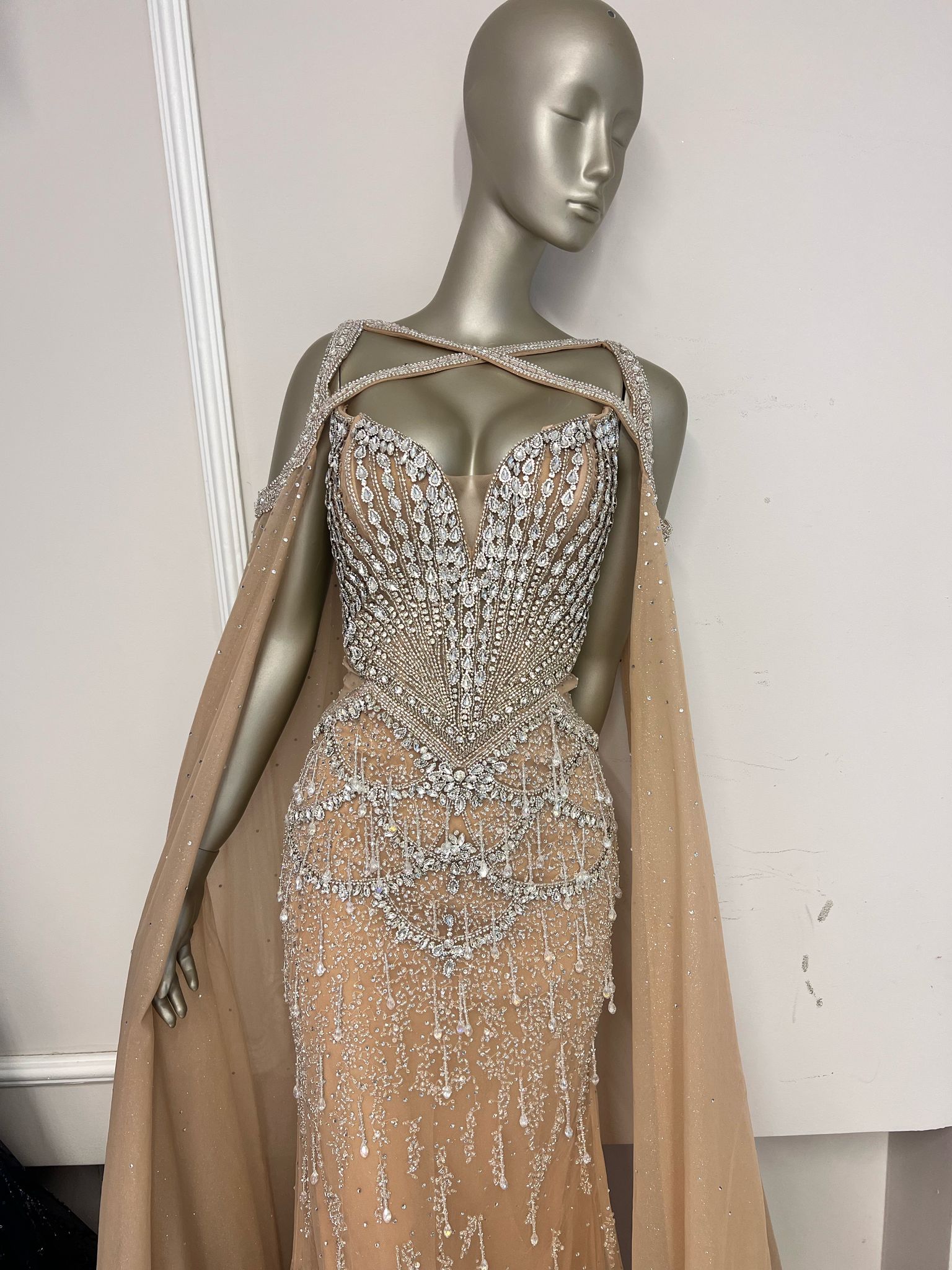 Elegant dress embellished with rhinestones, featuring long sleeves