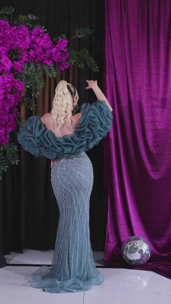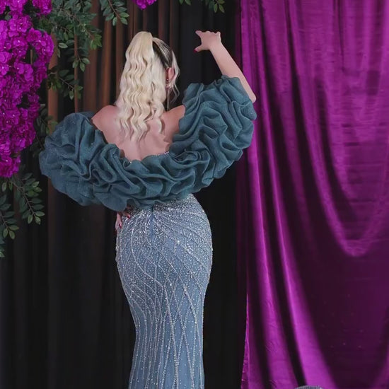 Luxury dress beautifully embroidered with stones, featuring two pieces on the sleeves
